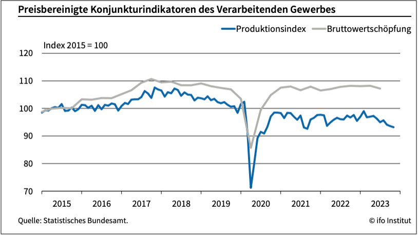 »Seit geraumer Zeit laufen zwei Kennziffern, welche die wirtschaftliche Lage im deutschen Verarbeitenden Gewerbe messen sollen, deutlich auseinander. Während die Industrieproduktion aktuell deutlich unter ihrem Niveau von 2015 liegt und damit zu einer Debatte über die Deindustrialisierung des Standorts Deutschland geführt hat, ist die Bruttowertschöpfung im selben Zeitraum spürbar gestiegen. Ursache der Diskrepanz ist ein struktureller Wandel, der mit veränderten Produktionsstrukturen und sinkenden Vorleistungsquoten einhergeht. Derzeit gibt es keine Anzeichen für eine breit angelegte Deindustrialisierung der deutschen Wirtschaft.« (Lehmann/Wollmershäuser 2024: 55).